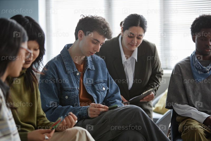 Различные подростки участвуют в консультативной сессии с женским консультантом