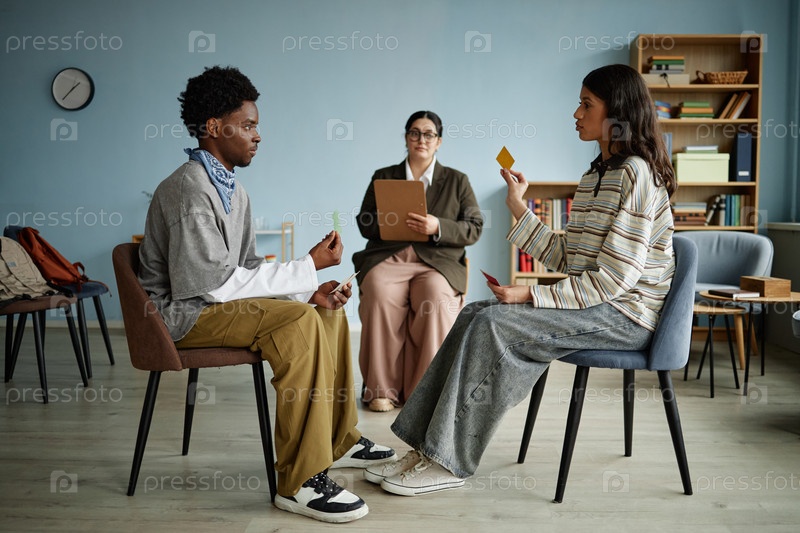 Черный подросток и испаноязычная девочка-подросток делятся открытками во время консультационной деятельности