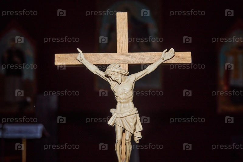 Деревянный распятие, изображающее Иисуса Христа отображается внутри христианской церкви