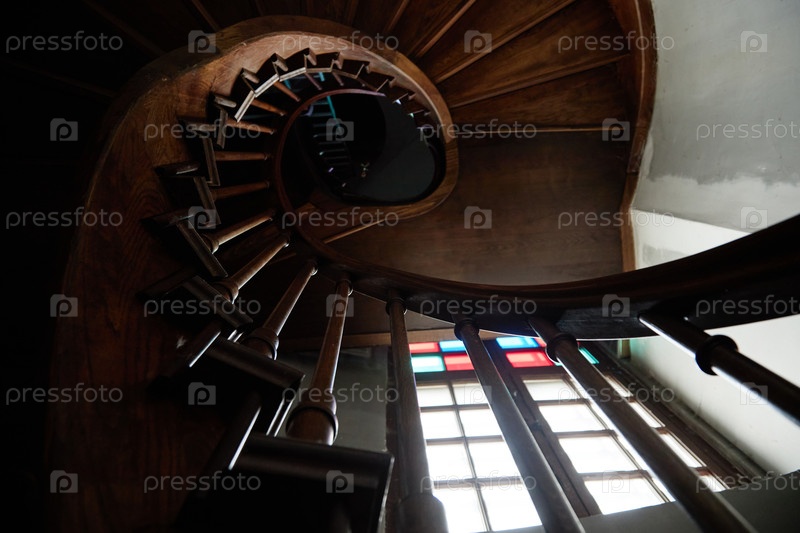 Изогнутая деревянная лестница ведет вверх внутрь исторического здания церкви