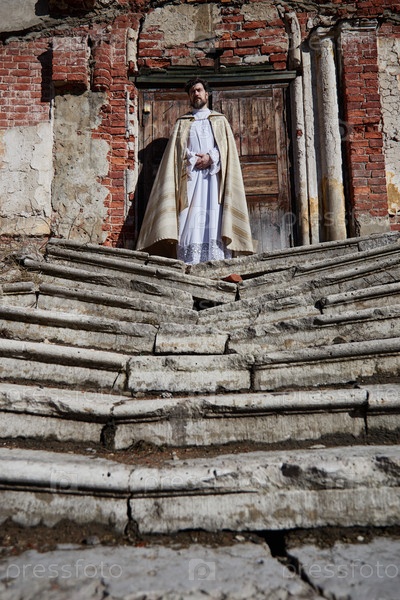 Мужчина средних лет, одетый в священника, стоит за исторической церковью