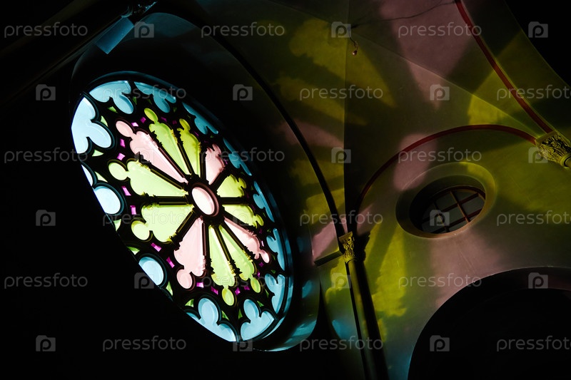 Стеклянные окна, отбрасывающие красочный свет внутри исторической церкви