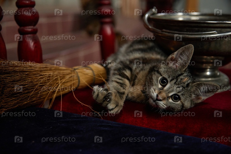Табби котенок лежит в помещении возле метлы, отдыхая на бархатной поверхности в церкви