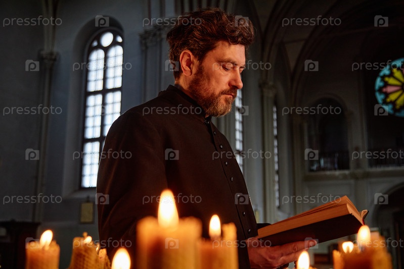 Мужчина средних лет читает Писание во время религиозной церемонии в церкви