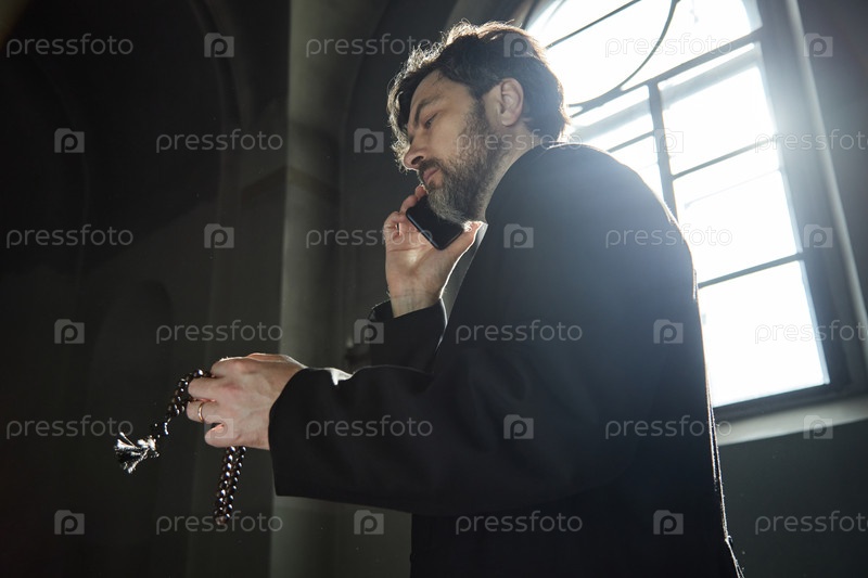 Мужчина средних лет молится с помощью Розария, разговаривая со смартфоном