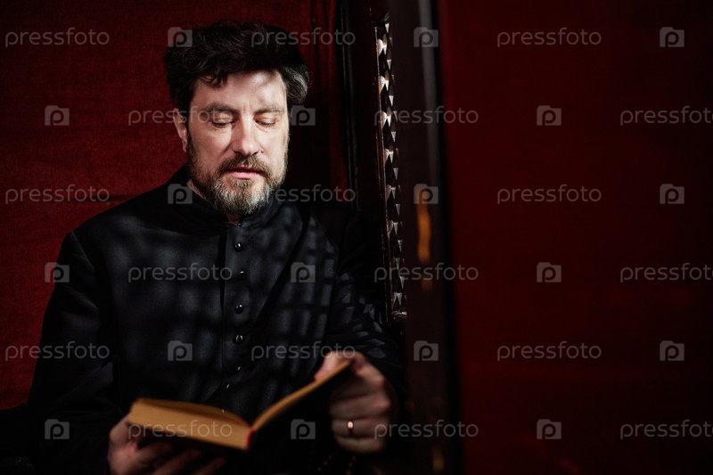 Мужчина среднего возраста читает книгу, сидя внутри церкви