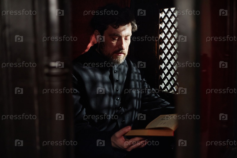 Человек, размышляющий над Писанием в одиночестве внутри церковной будки