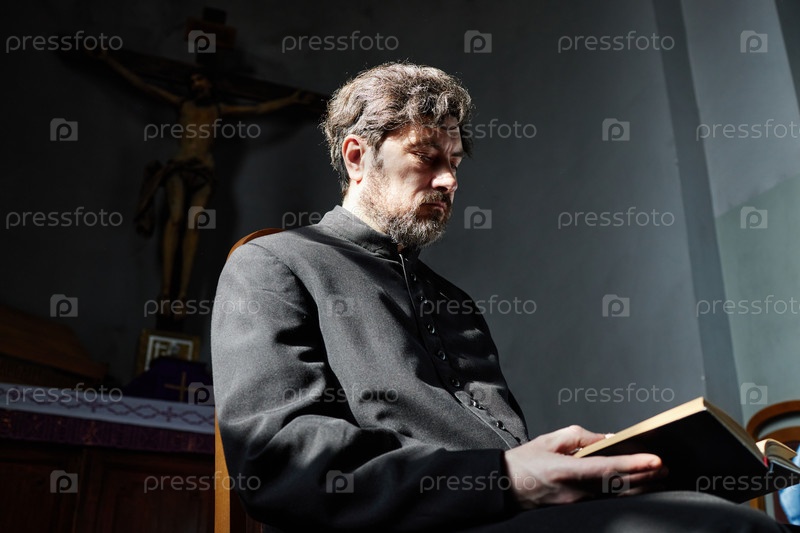 Мужчина средних лет молится и читает Библию внутри церковного святилища