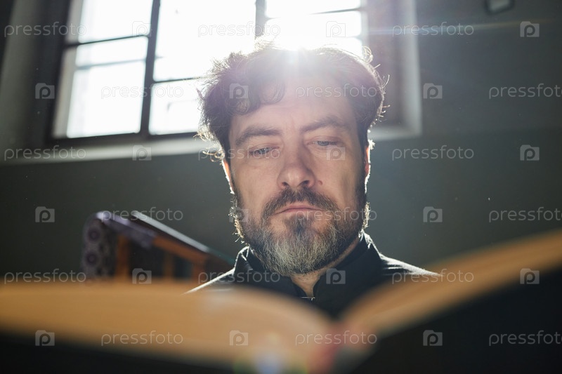 Портрет мужчины среднего возраста, читающего Писание внутри церкви