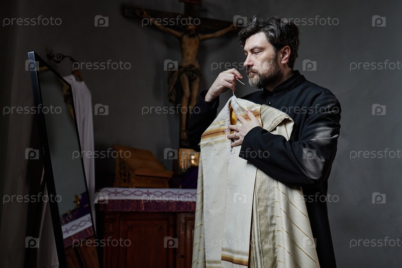 Мужчина средних лет готовит одежды в интерьере церкви