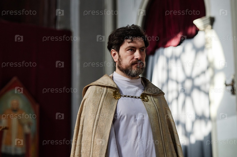 Мужчина средних лет, носящий священническую одежду, стоит внутри церкви