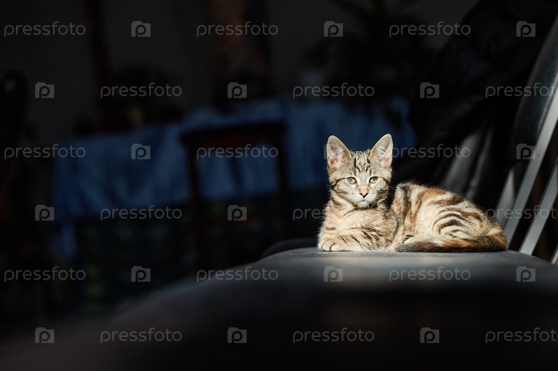 Табби Киттен отдыхает на скамейке внутри церкви во время дневного солнечного света