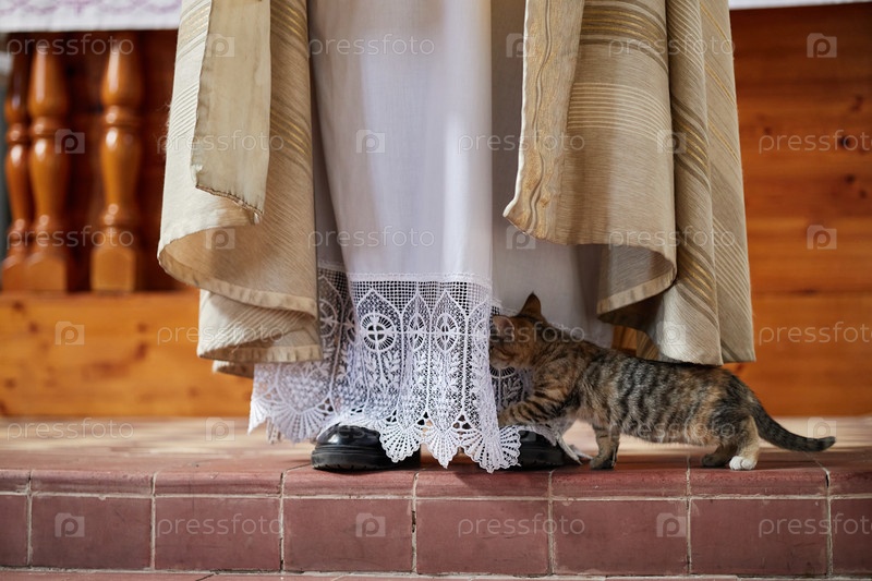 Священник, стоящий в церкви с приближающимся котом мужчиной