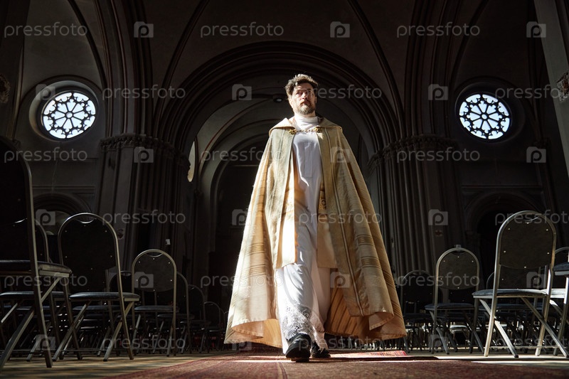 Священник, идущий вниз по проходу внутри церкви во время церемонии