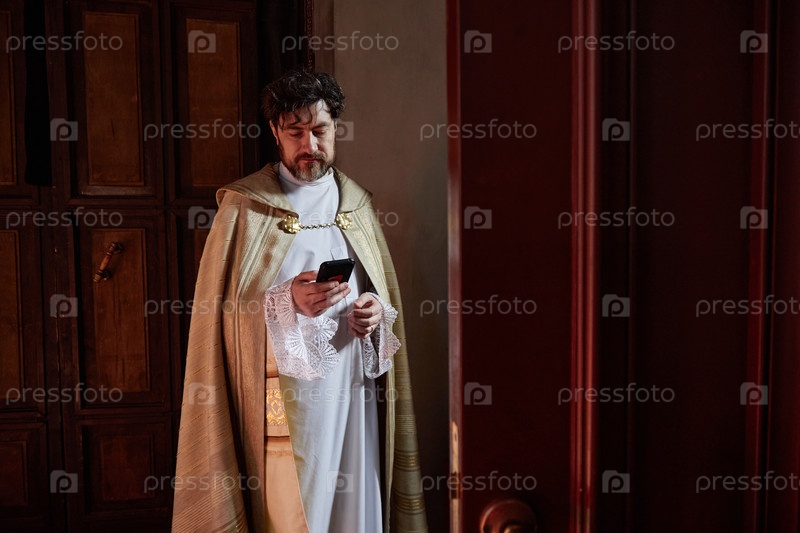 Мужчина средних лет в священническом халате использует смартфон внутри церкви