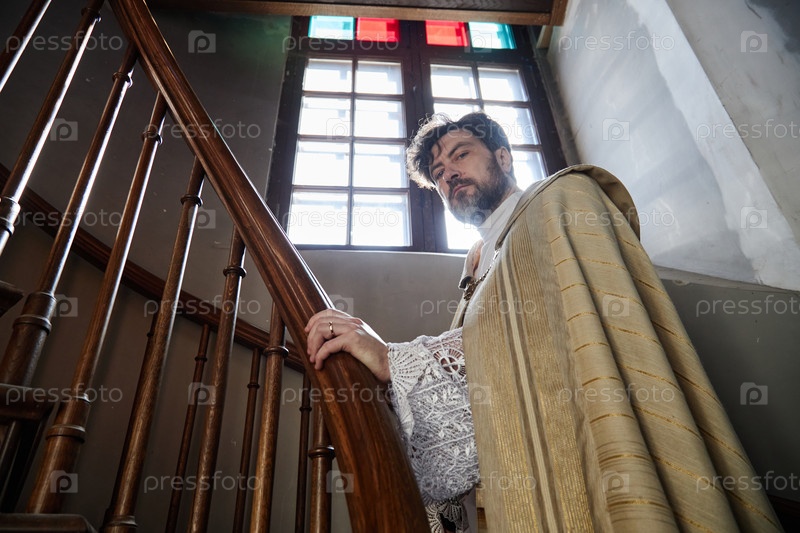 Портрет мужчины среднего возраста в одежде, стоящего внутри церкви