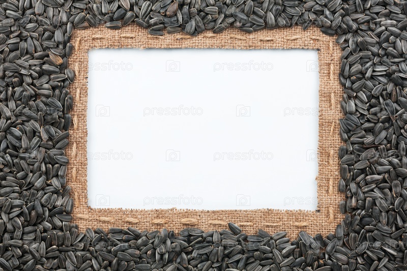 Рама из лопатки с линией и семенами подсолнечника лежит на белом фоне