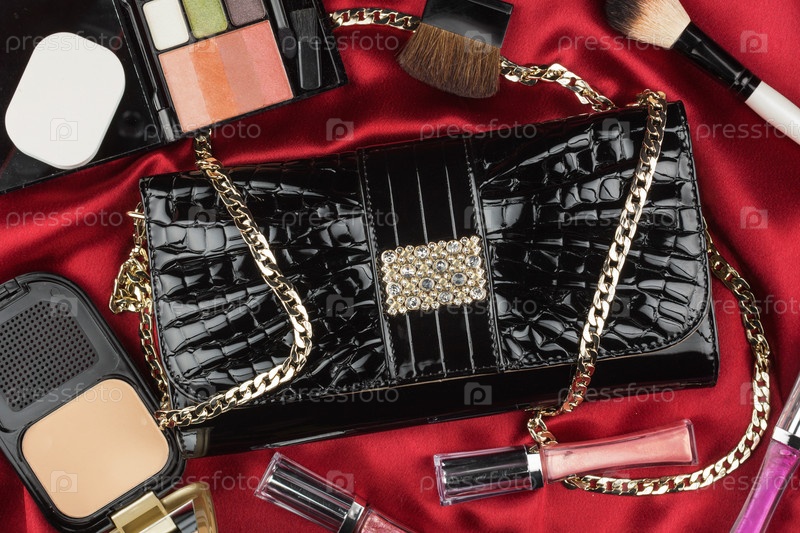 Красивая сумка из патентной кожи и косметики, лежащая на красном атласе