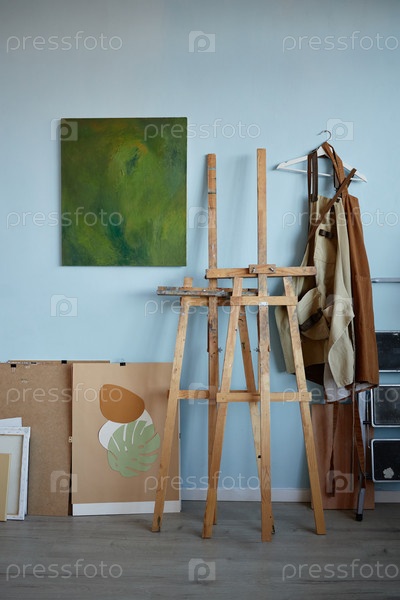 Пустой деревянный лоток, стоящий в художественной студии с холстом и принадлежностями к живописи