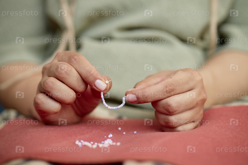 Руки женщины застегивают бусы во время изготовления ручной ювелирной продукции