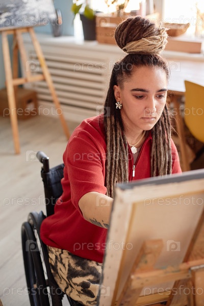 Молодая женщина-взрослый с инвалидностью сосредоточилась на живописи в Easel Indoors