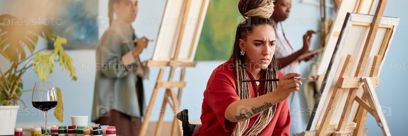 Молодая взрослая женщина концентрируется, рисуя на холсте в студии