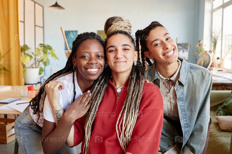 Портрет трех разных молодых взрослых женщин, улыбающихся вместе в помещении