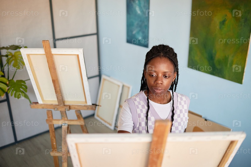 Молодая взрослая чернокожая женщина рисует на холсте в художественной студии внутри