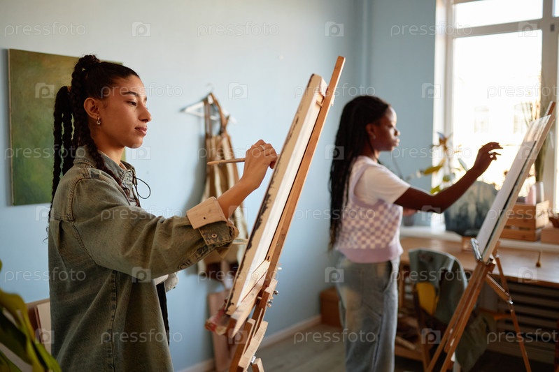 Молодые взрослые мультиэтнические женщины рисуют на лодках в Sunlit Art Studio