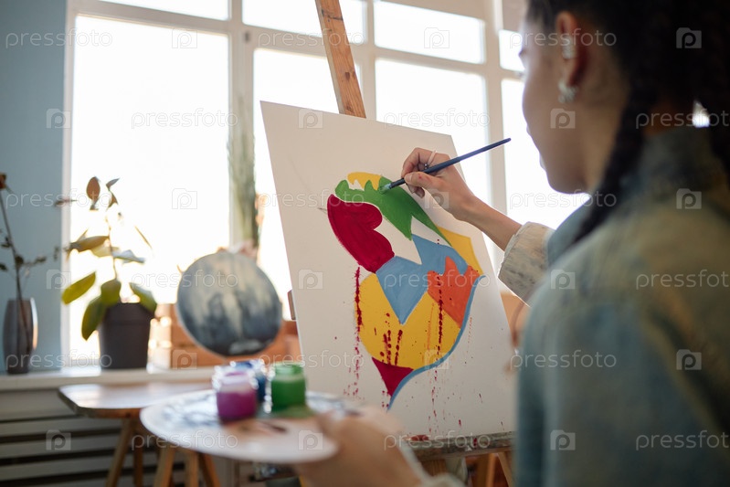 Молодая женщина рисует абстрактные произведения искусства на холсте в Bright Studio