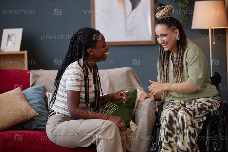 Молодая чернокожая женщина и молодая женщина с инвалидностью смеются вместе