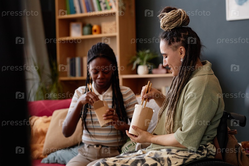 Молодая взрослая черная женщина и молодая взрослая женщина едят вместе