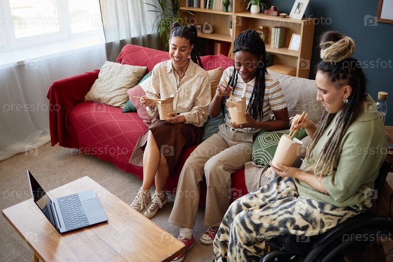 Разнообразные молодые женщины едят вместе, пока смотрят на ноутбук