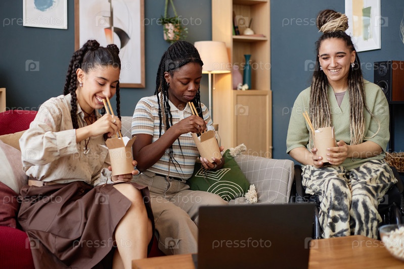 Разнообразные молодые взрослые женщины едят вместе лапшу, смотря на экран ноутбука