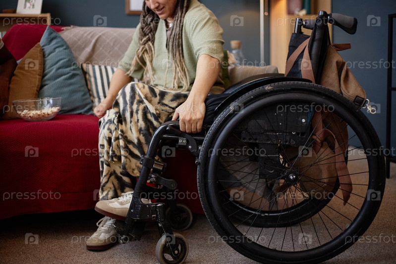 Молодая женщина-взрослый с инвалидностью, сидящая в инвалидной коляске внутри дома