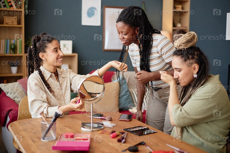 Мультиэтнические молодые женщины тестируют ароматы и улыбаются вместе в помещении