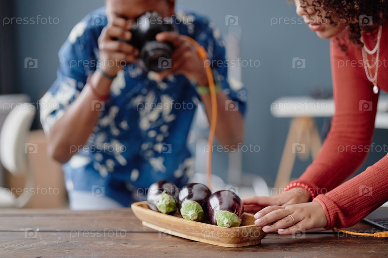 Молодой взрослый чернокожий мужчина фотографирует баклажаны, в то время как молодая взрослая женщина устраивает