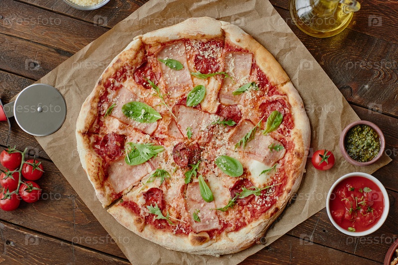 Свежевыпеченная пицца с ветчиной и листьями базилика в стиле фотографа