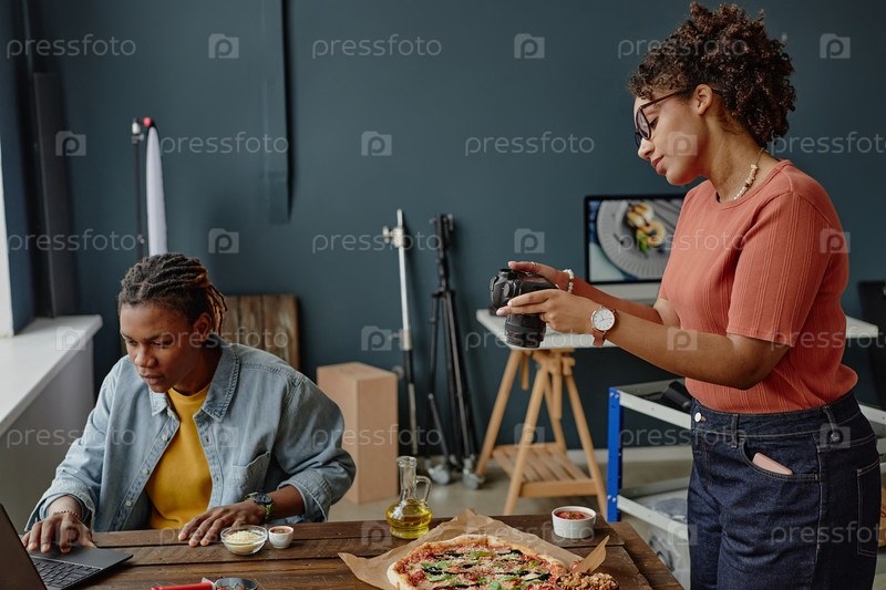 Молодая чёрная женщина фотографирует пиццу, в то время как черный мужчина работает