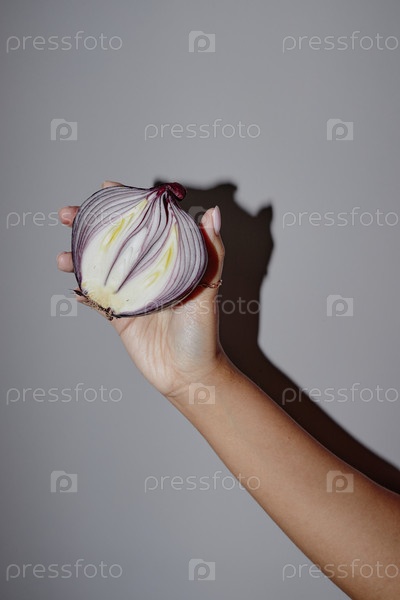 Женщина держит нарезанный красный лук на нейтральном фоне