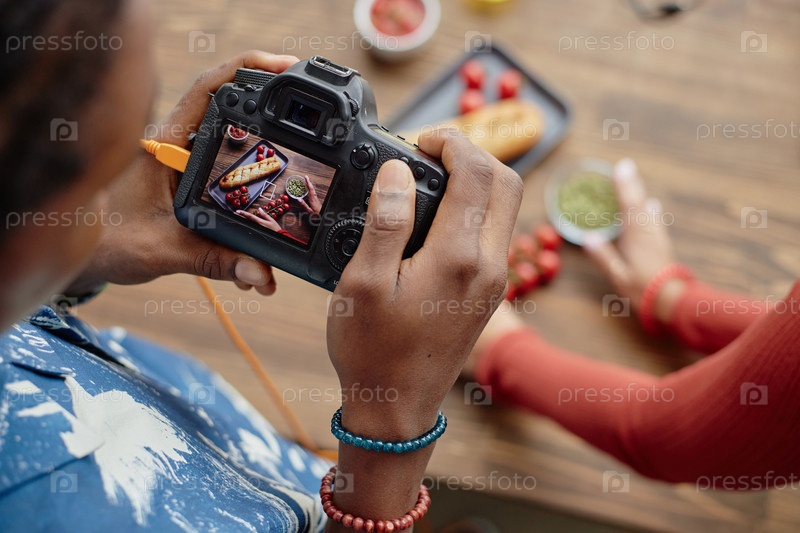 Молодой взрослый чернокожий мужчина фотографирует сцену приготовления пищи с помощью цифровой камеры
