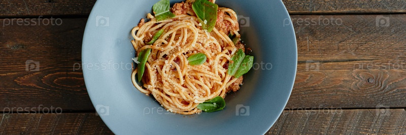 Ближайшее изображение итальянского блюда с макаронами со свежим базиликом и пармезаном на деревянном столе