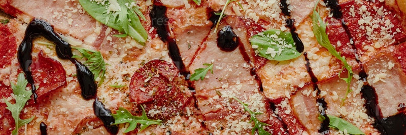 Ближайшее изображение свежевыпеченной пиццы, наполненной руккулой и бальзамическим мокротом