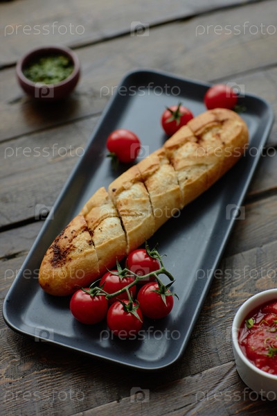 Нарезка багетта с вишневыми помидорами, расположенной на деревянном столовом столке
