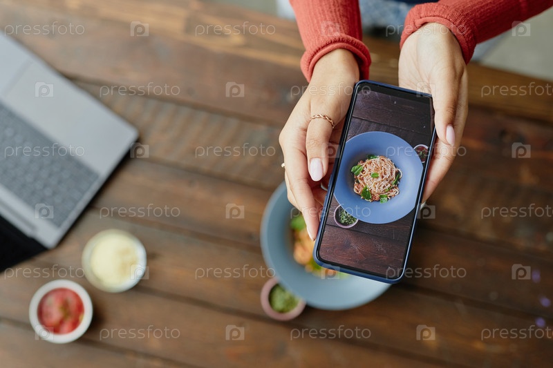 Молодая взрослая женщина фотографирует тарелку с макаронными изделиями со смартфоном за столом