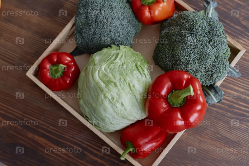 Свежий брокколи и красный перец, устроенные с салатами на деревянном столе