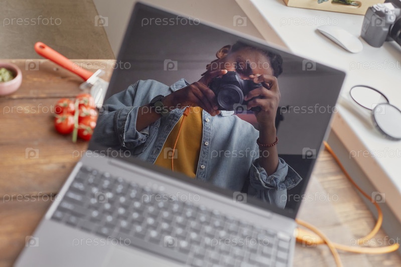 Молодой взрослый чернокожий мужчина фотографирует пищевую сцену, отраженную на экране ноутбука