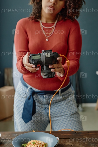 Молодая взрослая женщина просматривает фотографию продуктов питания на цифровой камере в помещении