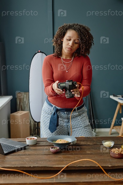 Молодая чернокожая женщина фотографирует еду на столе в профессиональной студии