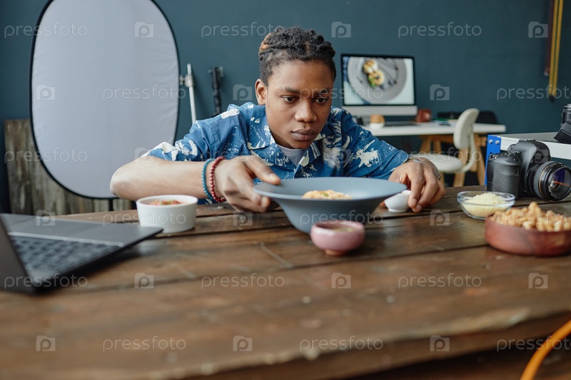 Молодой взрослый чернокожий мужчина устраивает еду на столе, готовясь к съемкам